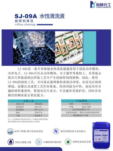 SJ-09A是一款PH值为中性的水基清洗剂,常用于清洗高精密PCBA、IGBT、IPM模块及半导体封装产品焊接后的助焊剂残留物。SJ-09A具有卓越的渗透性能和剥离能力,清洗时可以更好的渗入细微空间,成功的剥离助焊剂、锡膏残留。并且能兼容电子组装制造和清洗工艺中金属材料(铜、铝、镍等)