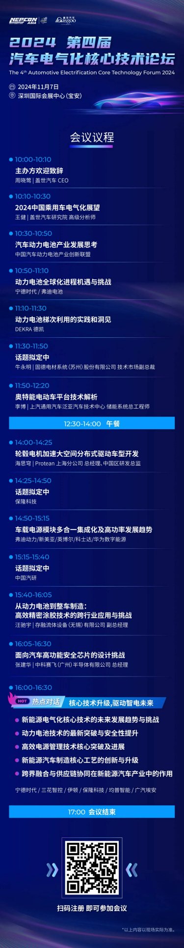 基于此背景,NEPCON ASIA 2024携手盖世汽车将于11月7日在深圳国际会展中心(宝安)举办2024第四届汽车电气化核心技术论坛论坛。立足于动力电池的技术创新与降本增效、动力电池出海、“小三电”的集成化和大功率发展、整车高压平台等行业焦点,邀请领军企业代表及行业技术专家重点围绕磷酸铁锂电池、半固态电池、全固态电池、新能源DC/DC转换器、高压连接器、全域SiC高压平台等话题进行深入探讨与交流,汇集行业智慧为行业的发展提供新思路。