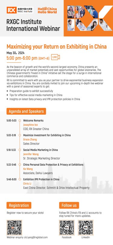 中国作为全球第二大经济体和增长引擎,为国际企业提供了巨大的市场潜力和出口商机。在中国政府推动高水平对外开放和引进外资等举措的大力推动下,中外商业合作将更加蓬勃发展。励展博览集团致力于通过在中国举办国际展览会推动国际企业对华业务的增长。我们定于5月30日面向国际企业举办国际网络研讨会,由资深专家在成功参展、中国社交媒体营销、中国最新的数据隐私保护要求和知识产权保护政策等维度给与专业建议。