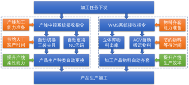 柔性产线(生产单元)管控系统作为一种先进的制造管理系统,通过由上至下的纵向综合管理模式,打通与 MES 系统、产线中控系统、WMS 管理系统的信息传递路线,以下发加工任务卡为起点,实现加工任务自动下发,产线中控系统与 WMS 仓储物流管理系统同步接收任务指令,产线自动更换夹具,自动切换 NC 代码,仓储物流系统进行物料配送,以信息化的手段对产线的生产能力及柔性加工能力指标进行管控升级,从而整体化的提升产线的综合生产能力。