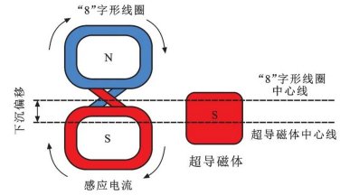 日本的MLU型系列超导电动磁悬浮列车的基本原理是“动生电”,其悬浮和导向原理如图3所示,为侧壁“8”字形线圈零磁通悬浮,用于悬浮和导向。当行车速度达到一定值时,辅助轮收起,导向轮收回,列车下沉,此时超导磁体中心线低于“8”字形线圈中心线,“8”字形线圈总磁通不为0,随行车位置不同而改变,在“8”字形线圈中形成感应电动势,从而感生电流。