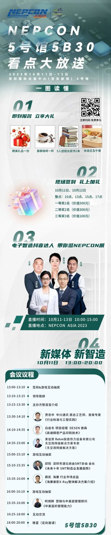 随着5G、人工智能、物联网等技术的快速发展,电子制造行业正在经历着产业升级、定制化生产、绿色制造、全球化和数字化转型等趋势的变革,这些趋势将对企业的发展产生深远的影响,电子制造企业需要不断更新其技术和设备,以满足新的市场需求。2023年10月11日-13日,超1,200家国内外龙头电路板组装解决方案品牌齐聚深圳,超100个新品首次亮相,超30场专业论坛引百家争鸣,帮助国内外全品类电子生产企业优化供应链、实现降本增效、拓展视野,促进亚洲电子制造产业链通力协作的NEPCON ASIA 2023亚洲电子展将与我们见面,聚焦消费电子、汽车电子、半导体制造、新能源、家电、电脑、通讯电子等领域,探讨参与发展趋势和解决之道,探索电子制造业的当下与未来!