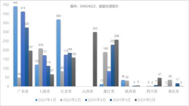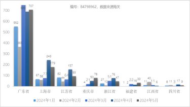 从整体趋势来看,1-5月广东省始终保持着较高的进口量达1426件,次之江苏省总进口量680件。