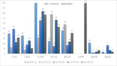 在1-5月装配与封装半导体器件或集成电路的机器及装置上,江苏省、四川省、浙江省进口量较高,广东省第四名,进口量较为稳定。另外,山西省5月份的销量有显著增长,达到100件。