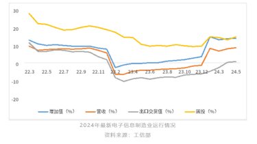 根据工信部数据,前5月,我国电子信息制造业行业整体增势明显,规模以上电子信息制造业增加值同比增长13.8%,增速分别比同期工业、高技术制造业高7.6个和5.1个百分点。5月,规模以上电子信息制造业增加值同比增长14.5%。