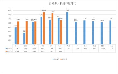 1、2025年1-6月自动贴片机进口总量为7380台,同比增长21%