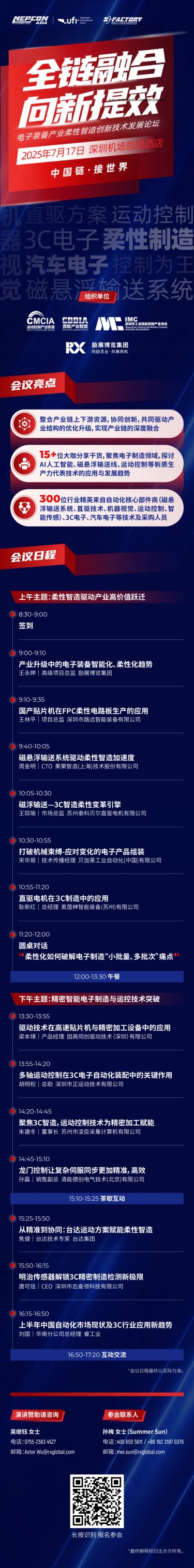 本次会议聚焦当前电子装备行业热门赛道,汇聚AI人工智能、磁悬浮输送系统、直驱方案、机器人/机械臂、机器视觉、运动控制、智能传感器等新质生产力代表,共同探讨柔性化、智能化先进制造技术的发展趋势与应用实践。