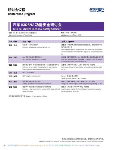 本届研讨会恰逢2020 AWC汽车电子技术展览会,届时将邀请OEM、零部件企业、检测认证机构、主被动安全技术供应商、半导体芯片、开发管理软件供应商、高校及科研院所等相关人士,分享探讨汽车电子产品的软硬件和系统、自动驾驶功能安全技术应用、ASPICE常见实施过程难点、ADAS功能安全技术落地等热门话题。