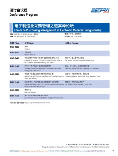 为此,励展博览集团和采购界联合在2020年8月28日在2020 NEPCON ASIA亚洲电子生产设备暨微电子工业展期间举办《电子制造业采购管理之道高峰论坛》,本次论坛活动邀请了多名行业内专家和企业为大家做一一深度解读和对策,旨在通过专题宣讲、社交拓展等方式,从行业趋势、管理创新、产业需求等,为行业领先企业人士与有采购影响力的关键人士提供面对面交流的机会,从而加深客户关系,为参展企业创造显著增值。